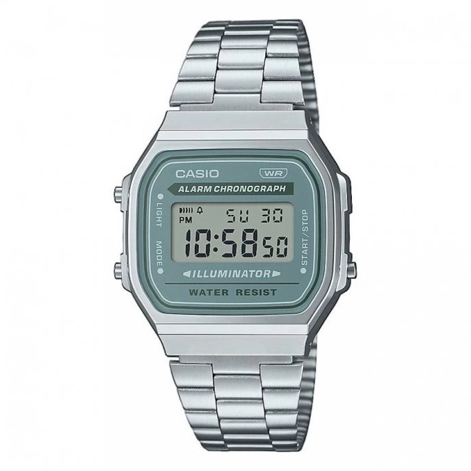 Strieborno-sivé hodinky Casio pre ženy aj mužov s digitálnym ciferníkom. Sú středně velké a retro. Ich strieborný remienok z nehrdzavejúcej oceli sa napojuje na puzdro zo živice. Zapínánie je na preklápaciu sponu. Tieto hodinky s quartz strojčekom sú jednoducho kvalitným módnym doplnkom. Sú vodeodolné do 3 ATM. Odolajú dažďu a umývanie rúk.